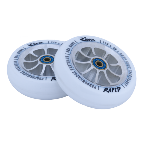 River Rapid’s are made to withstand a heavy thrashing in the street while keeping you in complete control. Strong, responsive and durable River Rapids will have you shredding the streets while keeping your flow. Featuring BUFF Core Technology which helps absorb impact, reduces de-hubbing and creates a smoother ride. All River wheels are manufactured with bearing removal slots for quick bearing replacement. All River wheels come with River Flash Floods Bearings pre-installed. The iconic 9-spoked anodized 6061 T-6 aluminum core creates a perfect balance of weight, strength and durability for a superior ride. Limited 90-day warranty against chunking and de-hubbing. 100% Made in the USA.