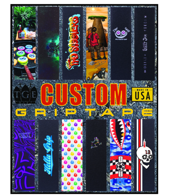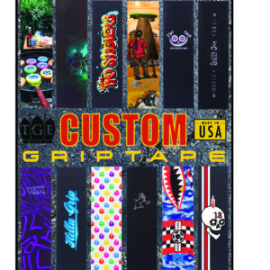 All custom grip tape orders are a 60 sheet minimum order. 1 time $40 set-up. 1-2 week turnaround. Produced IN-HOUSE by TGE Distribution on high quality grip tape. Email your vector art (ai file) or jpg image on a 7″ x 24″ artboard to sales@tgedistribution.com for review.