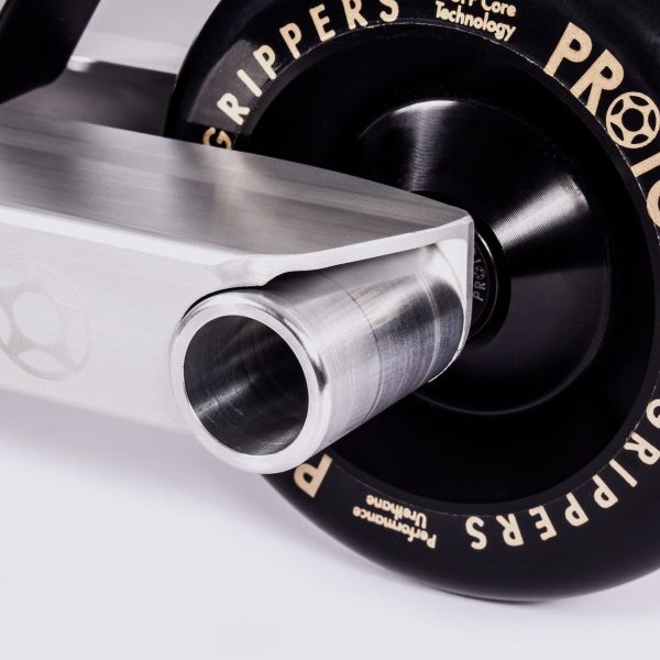 PROTO TDI™ DEX™ are the world’s first decks to feature Flush Mount Technology™. FMtech™ allows you to trash your old “cone” shaped pegs which are notorious for bending axles and being incompatible with wider decks and allows you to start using straight Cylindrical Pegs and PROTO Deck-Ends™ which provide superior reinforcement all the way to your Drop-Outs. With Flush Mount Technology, the Peg/Deck-End™ Diameter is now standardized so the Drop-Outs of the deck can perfectly contoured to fit your Pegs and Deck-Ends™ which allows the full width of your deck extrusion to provide an additional level of support for Drop-Out impact.