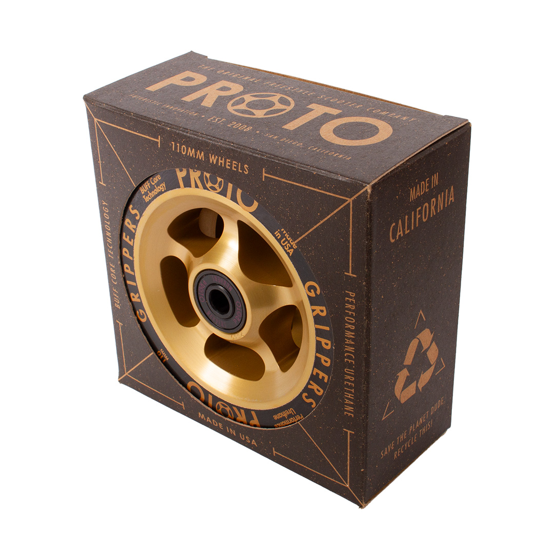 Gripper wheels are some of the fastest wheels on the market. PROTO Wheels are made in the USA and have an anodized core for durability. Featuring BUFF Core Technology to reduce dehubbing. All PROTO Scooter Wheels come with bearing removal slots for taking bearings out with ease. These wheels come with High Quality PROTO Murders Bearings Pre-installed. PROTO – STICKERS INCLUDED. Limited 90-day warranty.