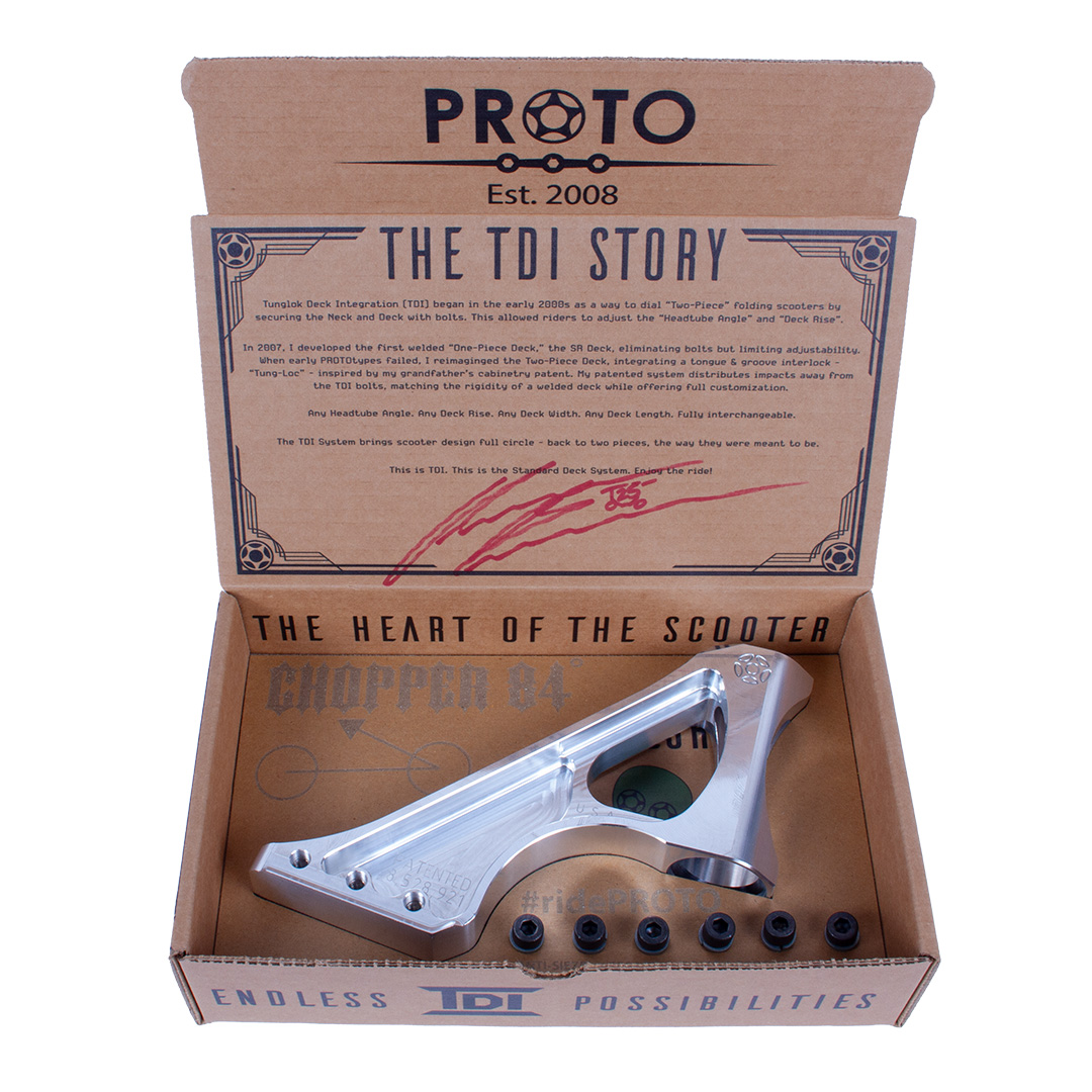 Tunglok Deck Integration (TDI) began in the early 2000s as a way to dial “Two-Piece” folding scooters by securing the Neck and Deck with bolts. This allowed riders to adjust the “Headtube Angle” and “Deck Rise”.
